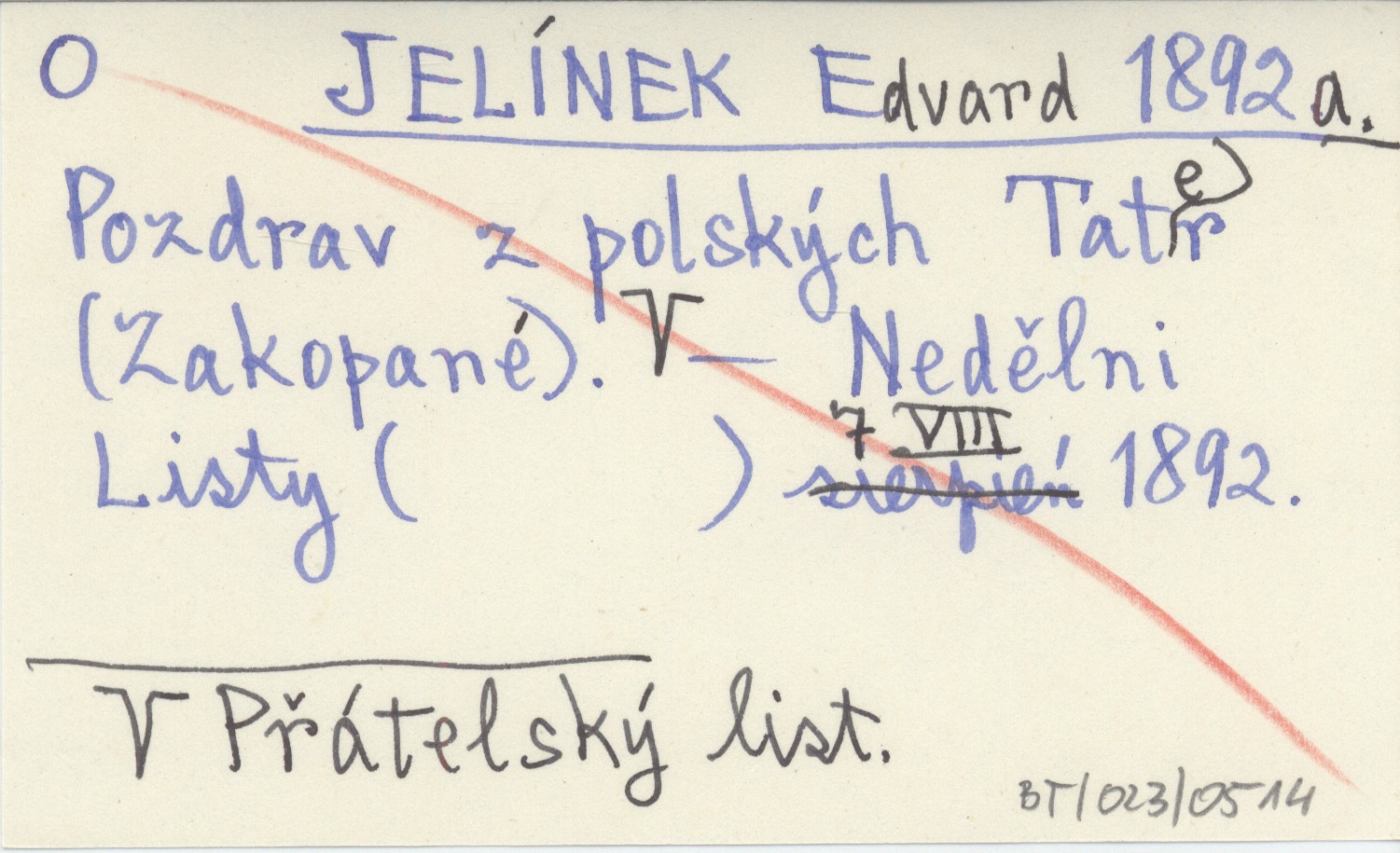 JELÍNEK Edvard 1892 a Pozdrav z polskęch Tater (Zakopané). Pűátelskę list.