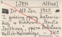 Dr. Alf. Jen. [JEN Alfred] 1927 Z gościny opery katowickiej w Krakowie. "Pomsta Jontkowa", opera Bolesława Wallek-Walewskiego.