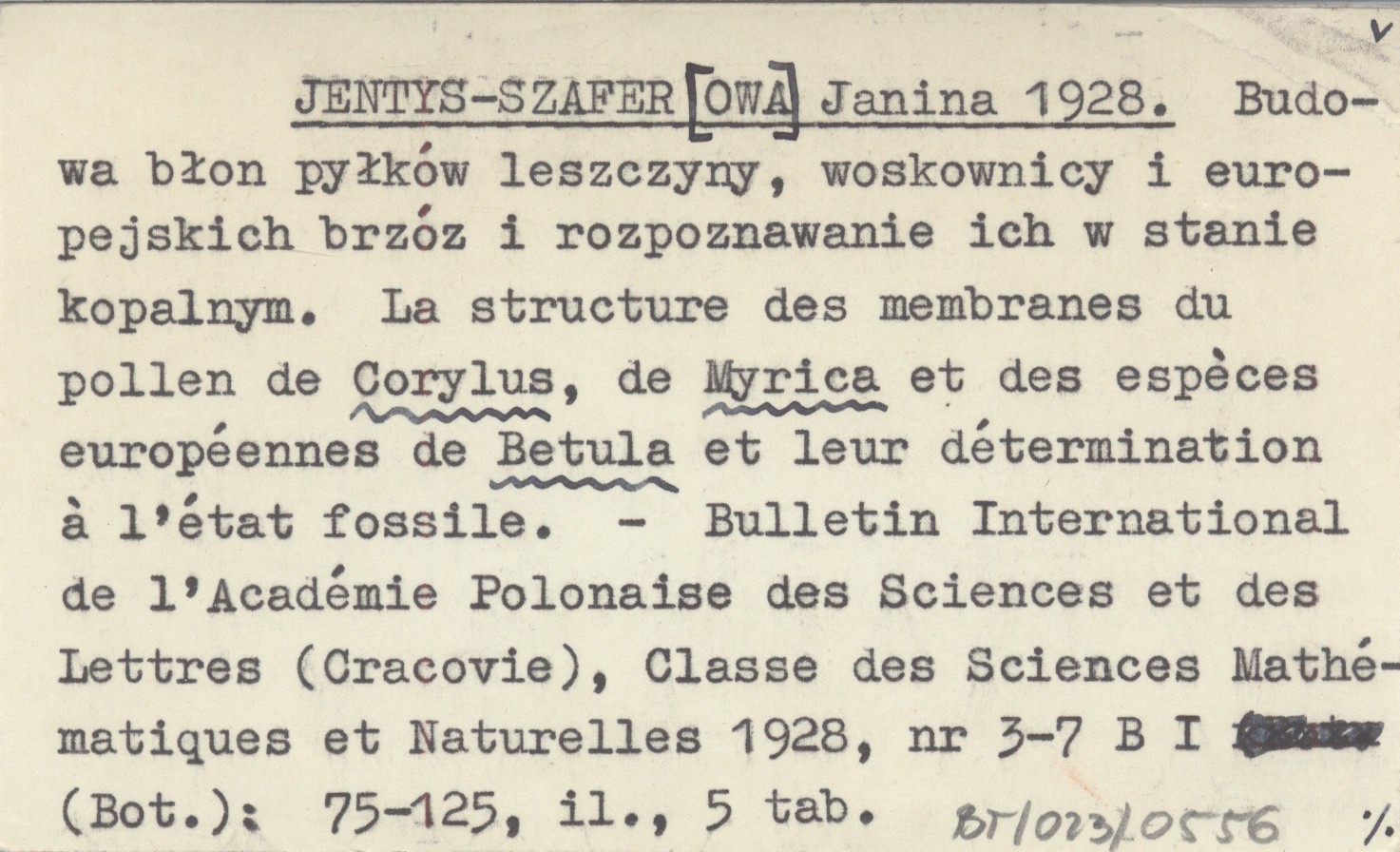JENTYS-SZAFER[OWA] Janina 1928 Budowa błon pyłków leszczyny, woskownicy i europejskich brzóz i rozpoznawanie ich w stanie kopalnym. La structure des membranes du pollen de Corylus, de Myrica et des especes européennes de Betula et leur détermination a l'état fossile.