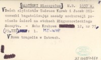 M. B. [BABIŃSKI Mieczysław] 1957 a Nowa tragedia w Tatrach. Dwóch alpinistów Tadeusz Korek i Jacek Bilczewski bagatelizując zasady asekuracji poniosło śmierć na stokach Mięguszowieckiego Szczytu.