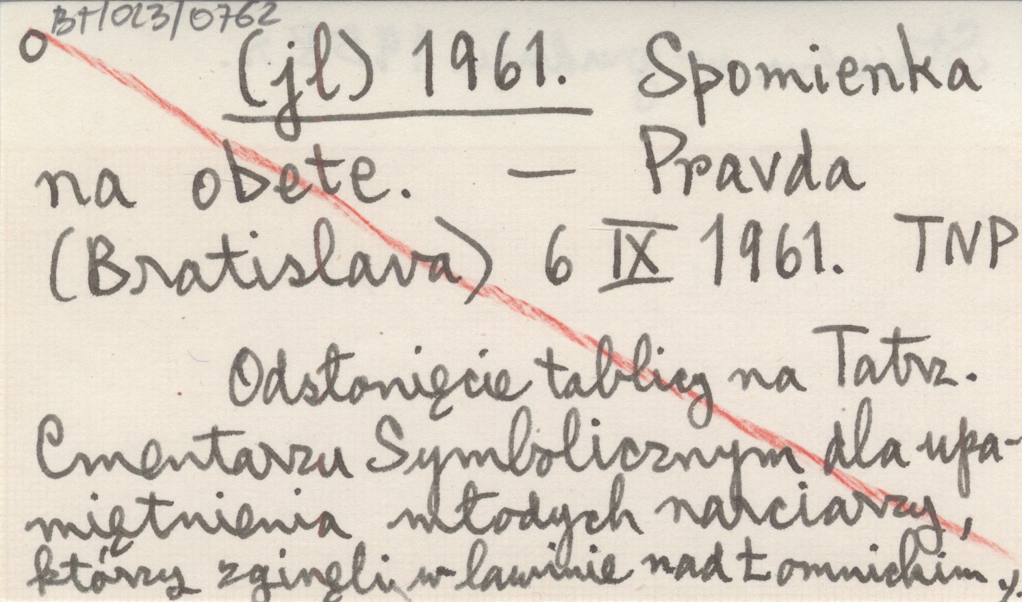 Pravda (Bratislava) , 6 IX 1961. Odsłonięcie tablicy na Tatrzańskim Cmentarzu Symbolicznym dla upamiętnienia młodych narciarzy, którzy zginęli w lawinie nad Łomnickim Stawem w grudniu 1958 r.