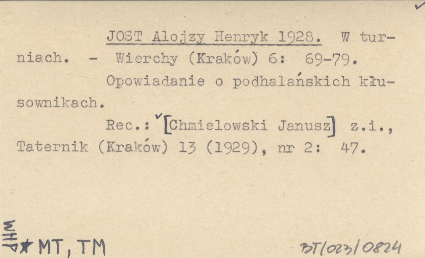 Wierchy (Kraków) , 6: 69-79. Opowiadanie o podhalańskich kłusownikach. REC: [Chmielowski Janusz] z.i., Taternik (Kraków) 13 (1929), nr 2: 47.