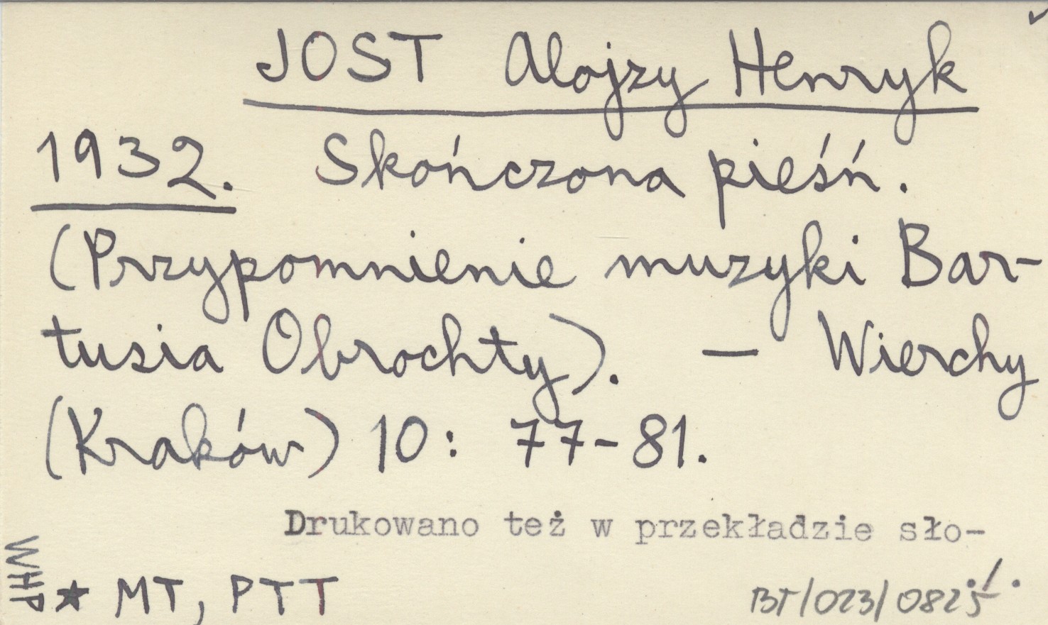 JOST Alojzy Henryk 1932 Skończona pieśń. (Przypomnienie muzyki Bartusia Obrochty).