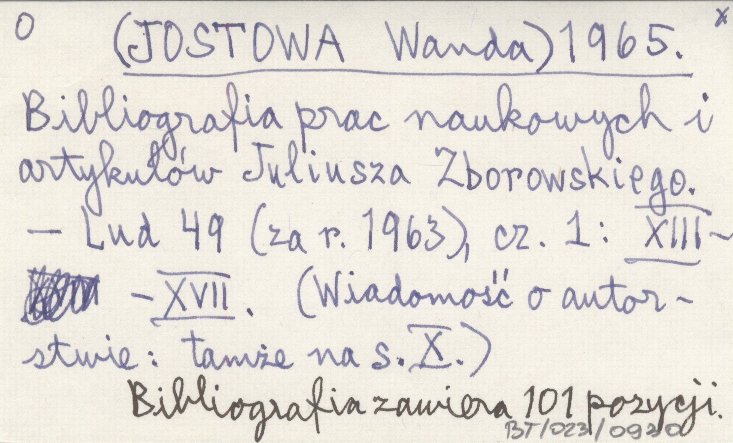 (JOSTOWA Wanda) 1965 Bibliografia prac naukowych i artykułów Juliusza Zborowskiego.