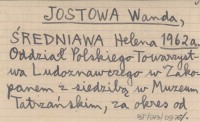 JOSTOWA Wanda ŚREDNIAWA, Helena. ; 1962 a Oddział Polskiego Towarzystwa Ludoznawczego w Zakopanem z siedzibą w Muzeum Tatrzańskim, za okres od 1.I. do 15.IX.1962 r.