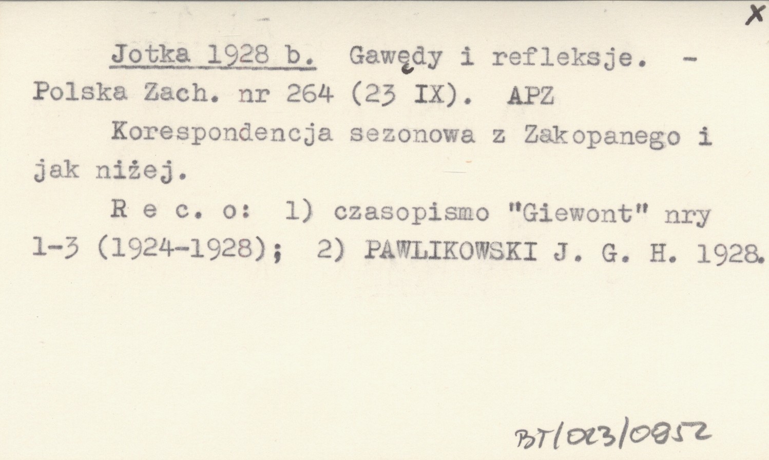 Polska Zachodnia, Nr 264 (23 IX). Korespondencja sezonowa z Zakopanego i jak niżej. Rec.o: 1) czasopismo "Giewont" nr 1-3 (1924-1928); 2) PAWLIKOWSKI J. G. H. 1928.