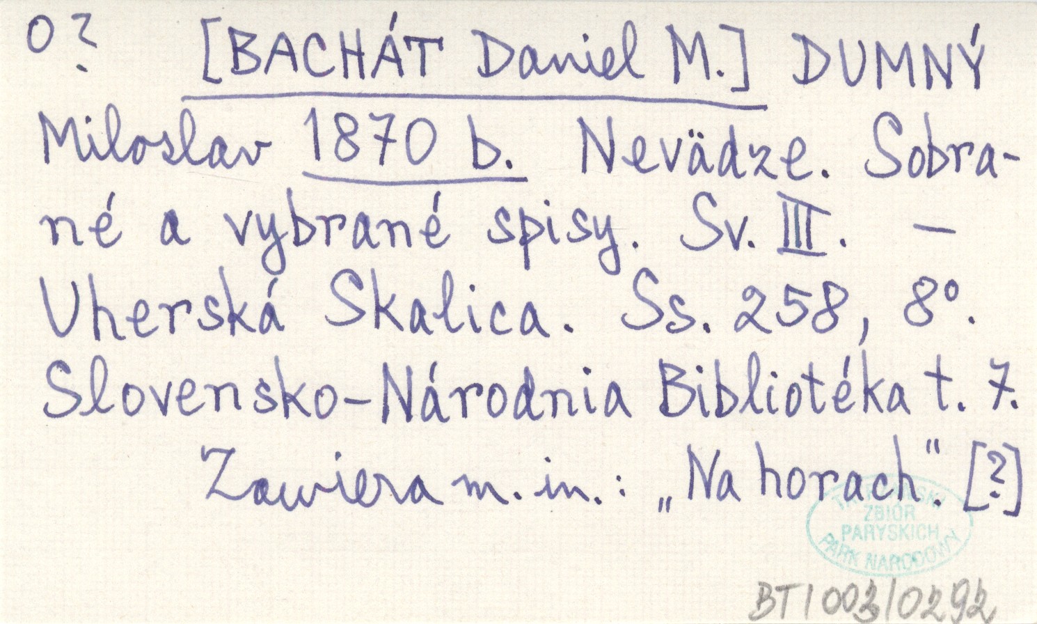 [BACHÁT Daniel M.] DUMNÝ, Miloslav. ; 1870 b Nevädze. Sobrané a vybrané spisy. Sv. III.