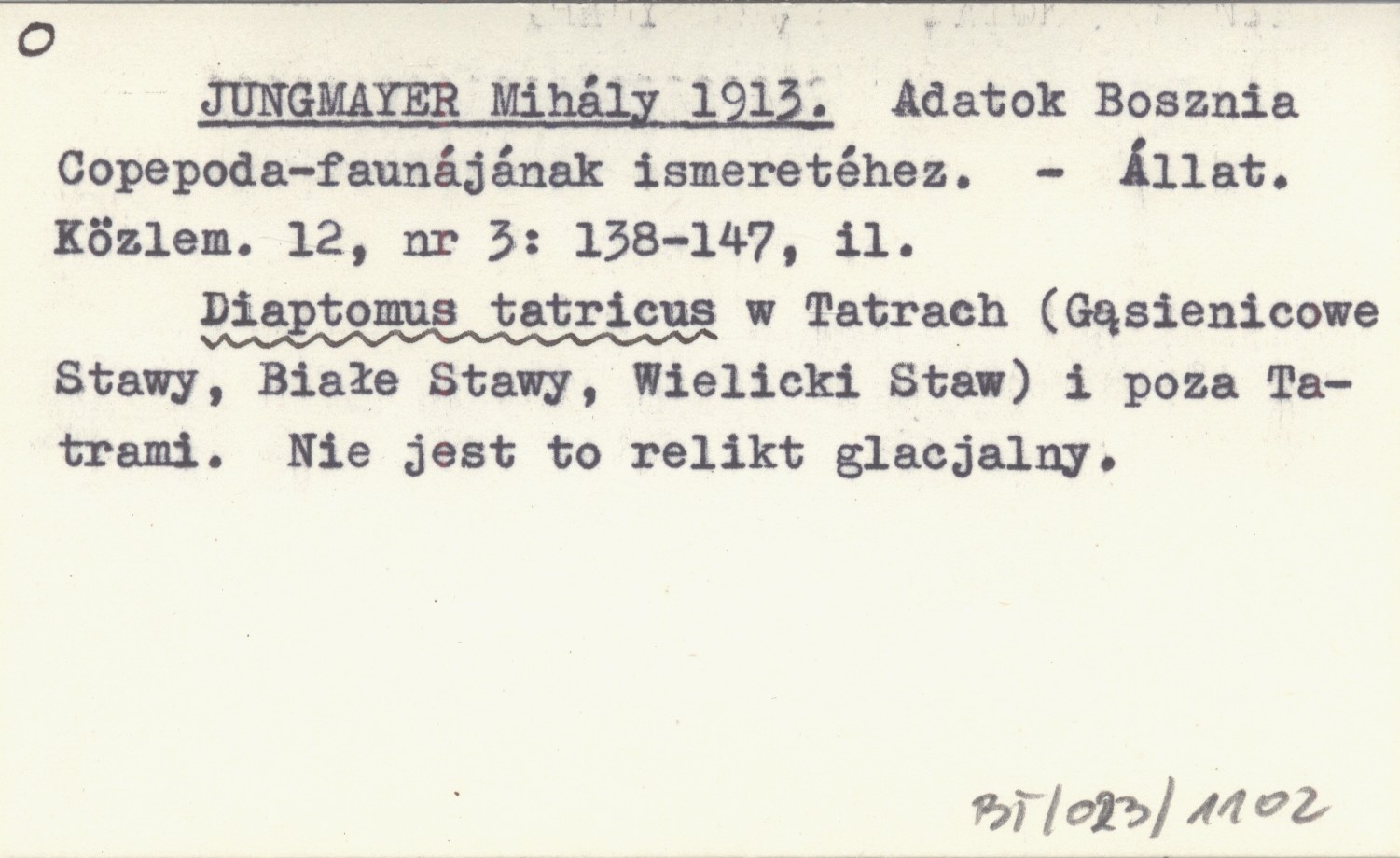JUNGMAYER Mihály 1913 Adatok Bosznia Copepoda-faunájának ismeretéhez.