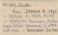 Światowit (Warszawa) , T. 21: 81-124, il. REC: JAMKA R. 1961. NOSEK S. 1967: 100-101. KOWALSKI Kazimierz, Archeologia Polski (Warszawa) 1, r. 1957: 240-242. KOZŁOWSKI J.K. 1961.