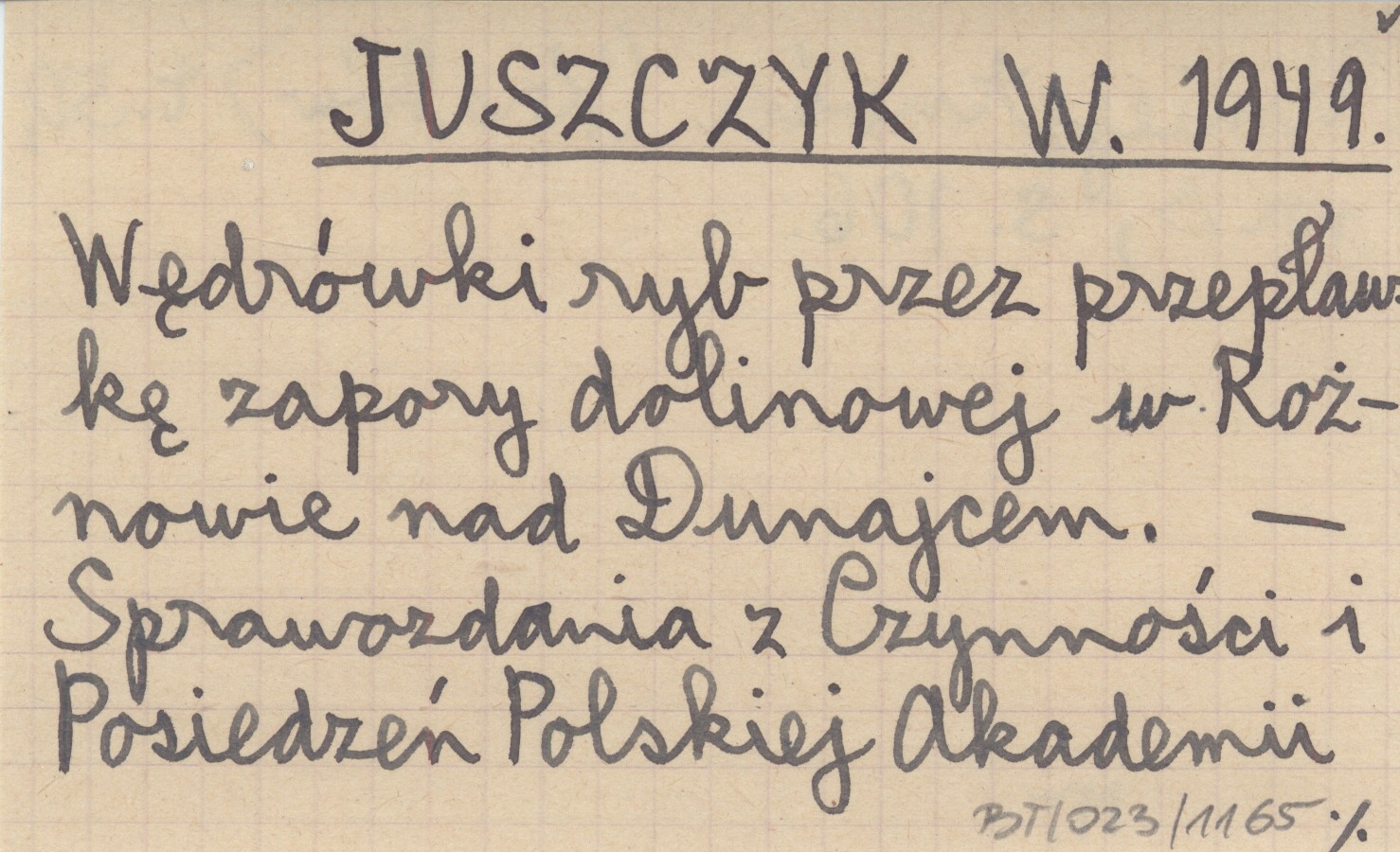 JUSZCZYK W. 1949 Wędrówki ryb przez przepławkę zapory dolinowej w Rożnowie nad Dunajcem.