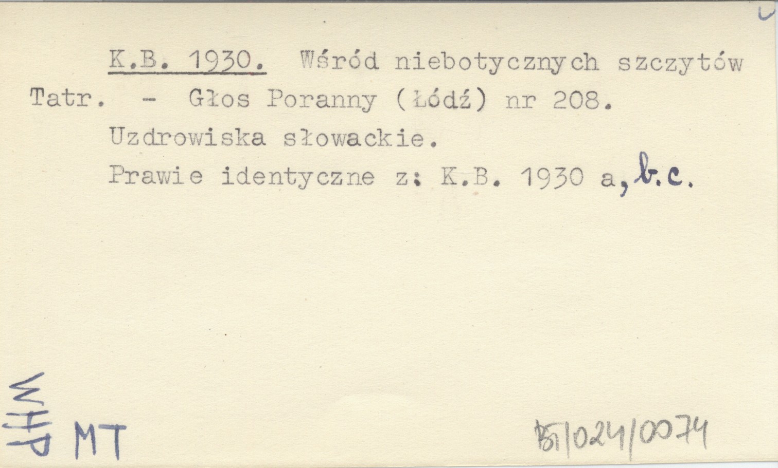 Głos Poranny (Łódź) , Nr 208. Uzdrowiska słowackie. Prawie identyczne z: K.B. 1930 a, b.c. K.B. 1930 a, b.c