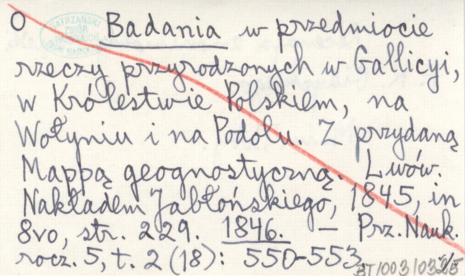 Badania w przedmiocie rzeczy przyrodzonych w Gallicyi, w Królestwie Polskiem, na Wołyniu i na Podolu. Z przydaną Mappą geognostyczną. Lwów. Nakładem Jabłońskiego, 1845, in 8vo, 229 s. 1846