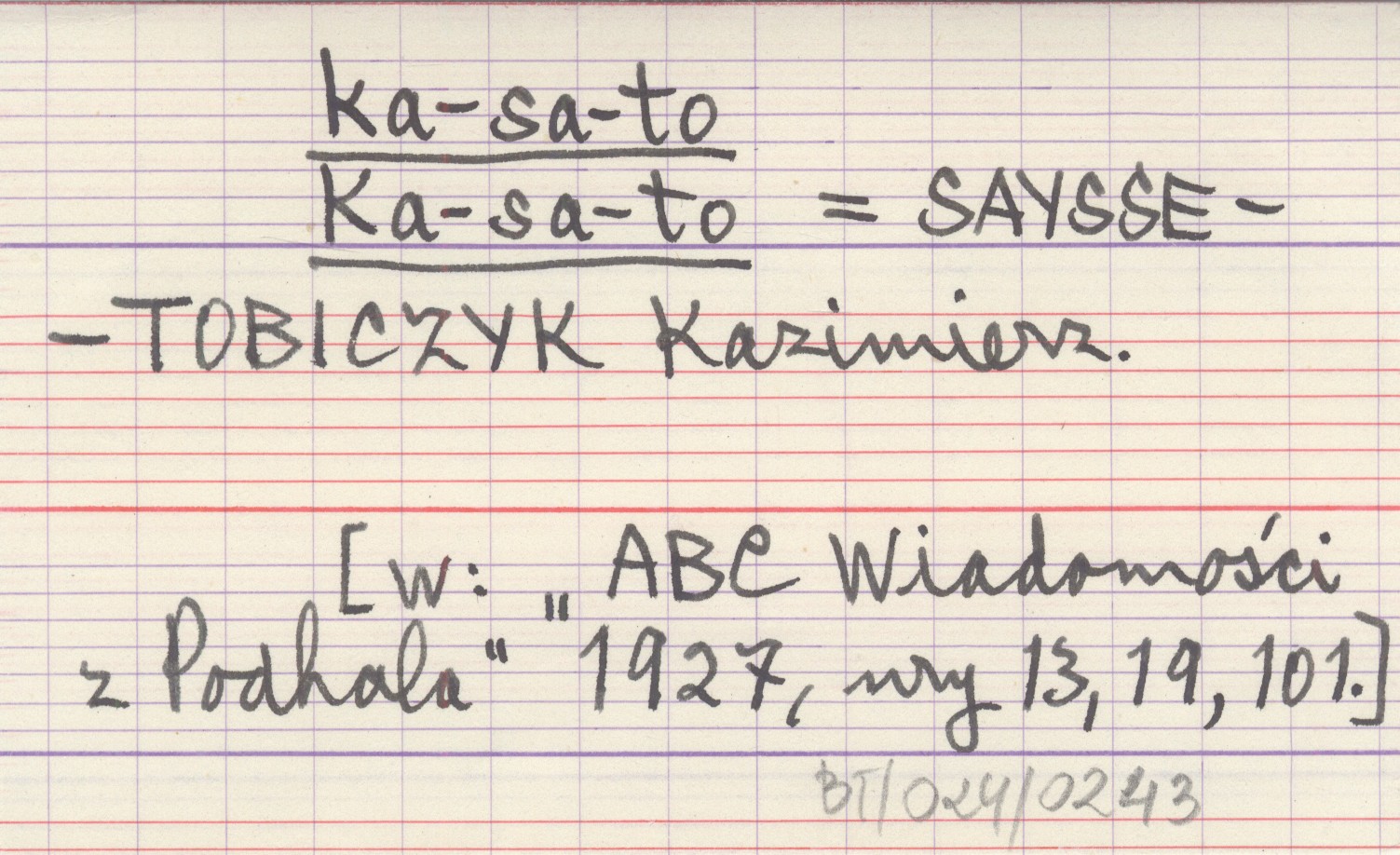 ka-sa-to ; Ka-sa-to SAYSSE-TOBICZYK Kazimierz [W: "ABC Wiadomości z Podhala" 1927, nr 13, 19, 101].