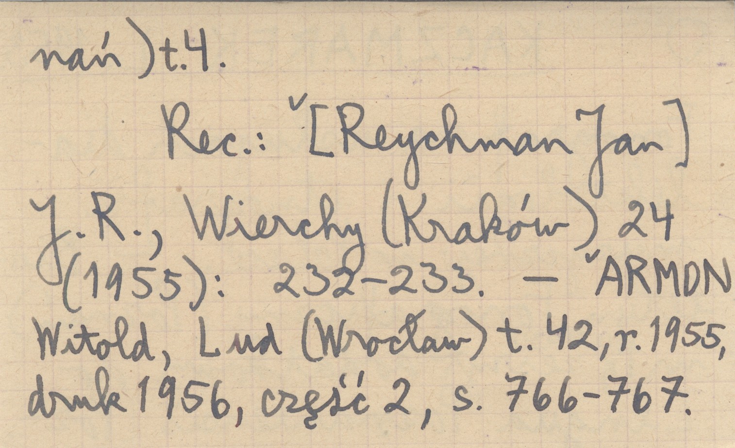 Lingua Posnaniensis, zesz. dod. Biuletyn Fonograficzny (Poznań) , T. 4, nr 1: 19-54. REC: [Reychman Jan] J. R., Wierchy (Kraków) 24 (1955): 232-233. ARMON Witold, Lud (Wrocław) t. 43, r. 1955, druk 1956, cz. 2: 766-767.