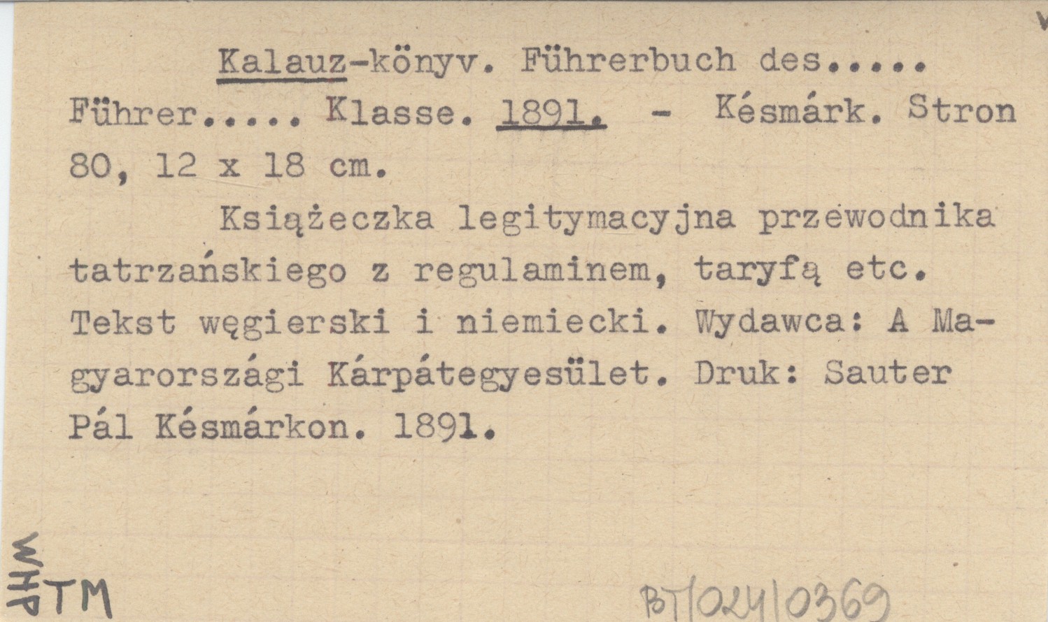 A Magyarországi Kárpátegyesület, Késmárk , 80 s., 12x18 cm. Ksi±żeczka legitymacyjna przewodnika tatrzańskiego z regulaminem, taryf± etc. Tekst węgierski i niemiecki. Druk: Sauter Pál Késmárkon. 1891.