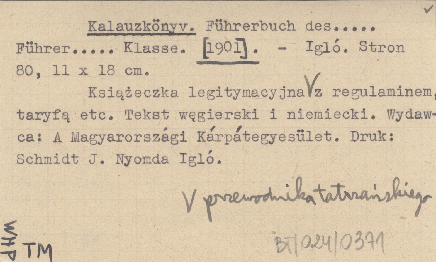 A Magyarországi Kárpátegyesület, Igló , 80 s., 11x18 cm. Książeczka legitymacyjna przewodnika tatrzańskiego z regulaminem, taryfą etc. Tekst węgierski i niemiecki. Druk: Schmidt J. Nyomda Igló.