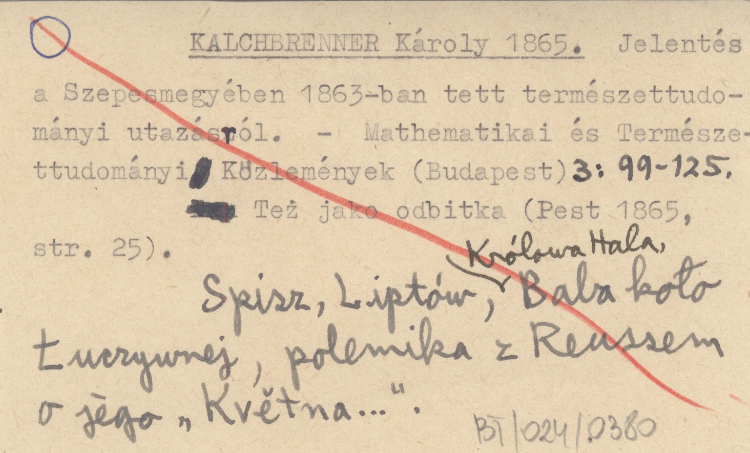 Matematikai és Természet-tudományi Közlemények, 3 (1863-1864): 99-125. Sprawozdanie z podróży przyrodniczo-naukowej po Spiszu w 1863 r. Spisz, Liptów, Królowa Hala, Baba koło Łuczywej, polemika z Reussem a jego "Května...". Też jako odbitka (Pest 1865, 25 s.).