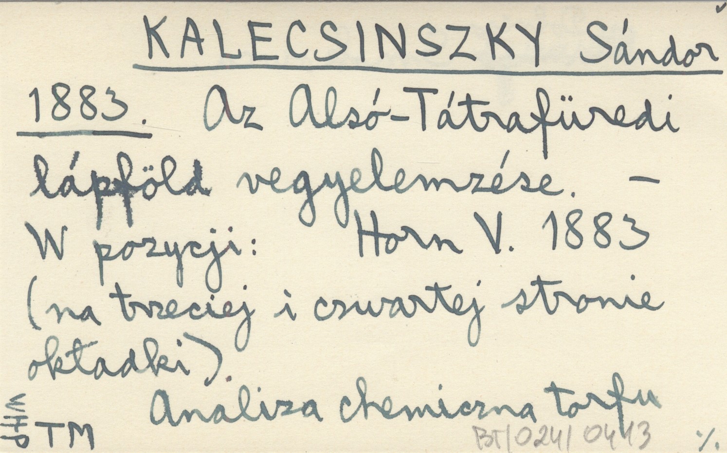 KALECSINSZKY Sándor 1883 Az Alsó-Tátrafüredi lápföld vegyelemzése.