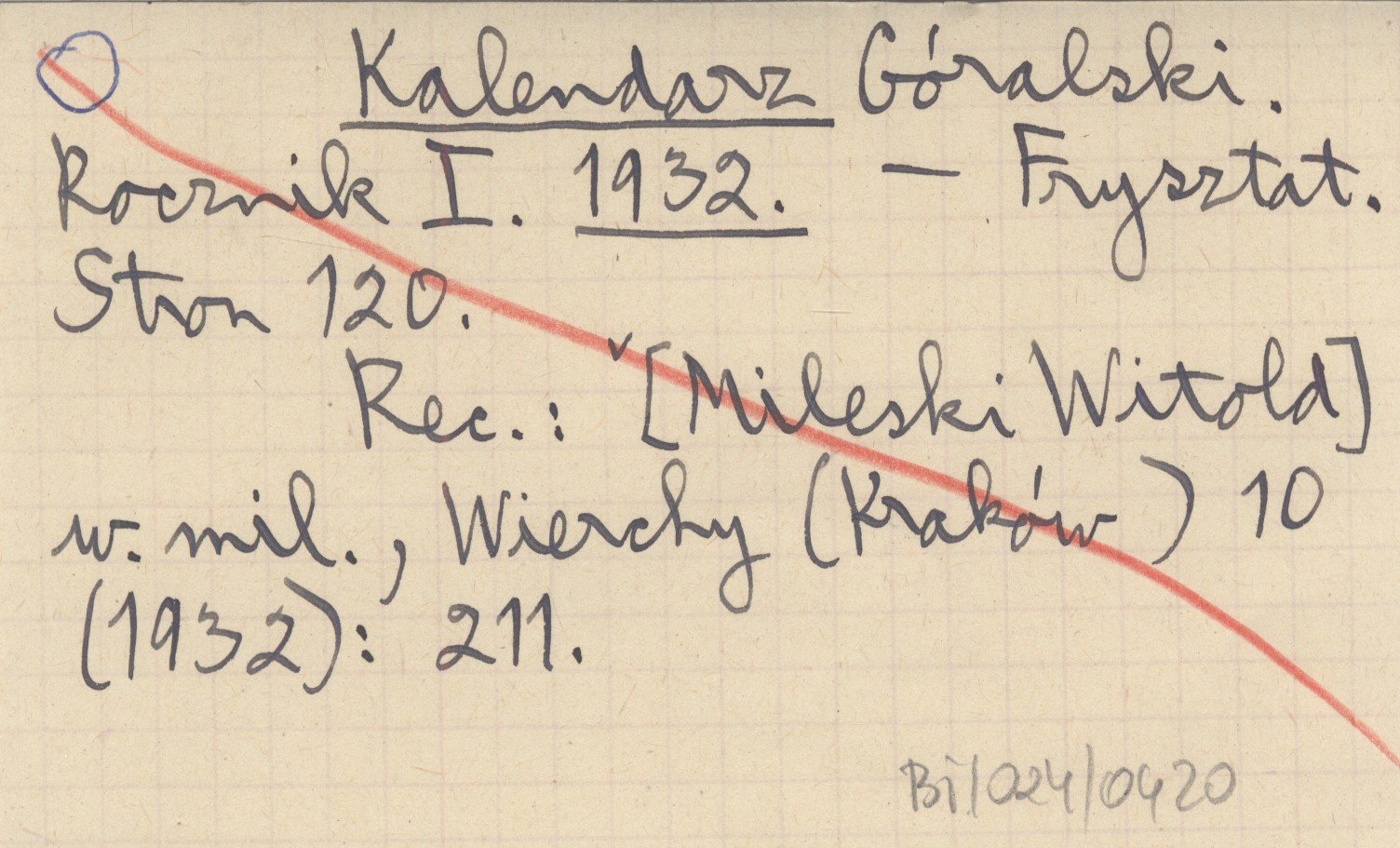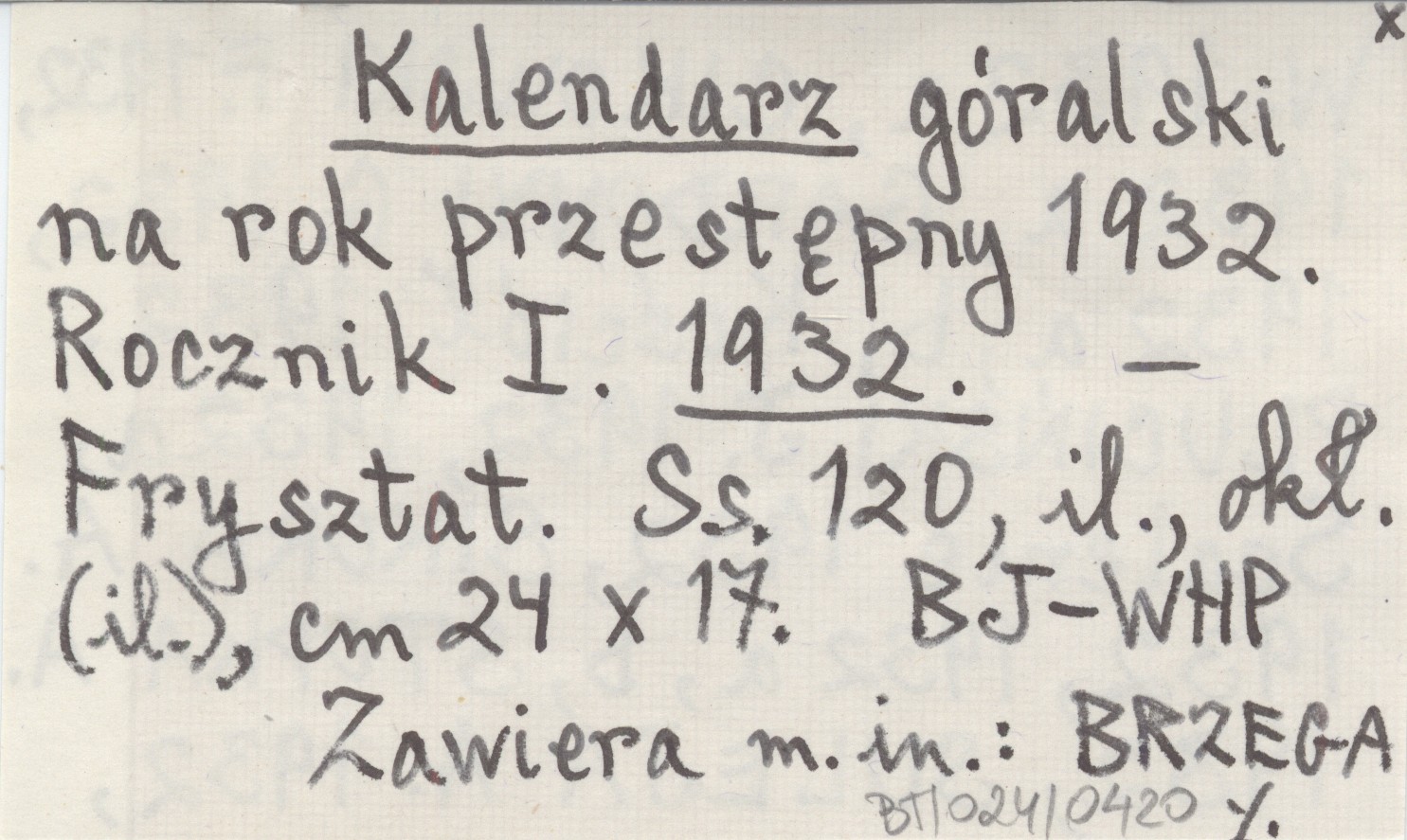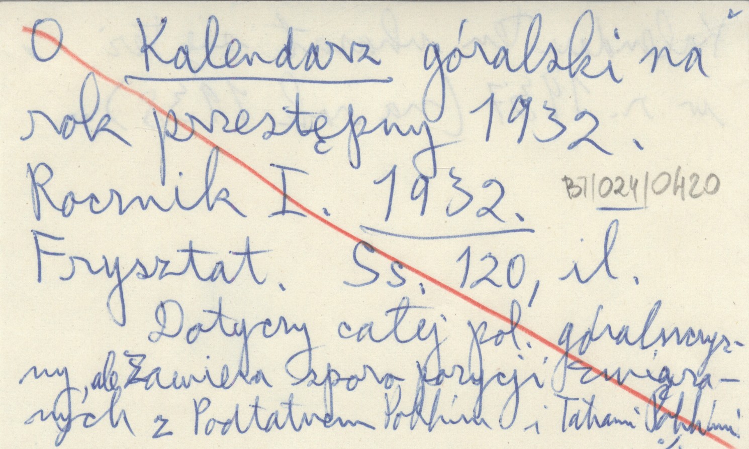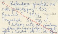 Frysztat , 120 s., il., okł. (il.), 24x17 cm. Dotyczy całej polskiej góralszczyzny, ale zawiera sporo pozycji związanych z Podtatrzem Polskim i Tatrami Polskimi. Kalendarz ten ukazał się też w r. 1937 (na rok 1938). Zawiera m. in.: BREZGA W. 1932 a, CIKOWSKI F. 1932, 1932 a, GÁRDONYI G. 1932, 1932 a, b, Kościół 1932, PLUCIŃSKI J. 1932, 1932 a, Scalenie 1932, SIKORA A. 1932, 1932 a, b, STOPKA A. 1932, SULEJA A. 1932, TETMAJER K. 1932, 1932 a, b, c. REC: [Mileski Witold] w. mil., Wierchy (Kraków) 10 (1932): 211.