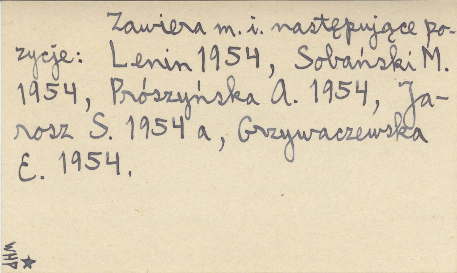 Warszawa , 240 s., il., okł., 15x20 cm. Opracował zespół pod redakcją Stefana Kobrzyńskiego i [] Maliszewskiego. Zawiera m. in. następujące pozycje: Lenin 1954, Sobański M. 1954, Prószyńska A. 1954, Jarosz S. 1954 a, Grzywaczewska E. 1954.