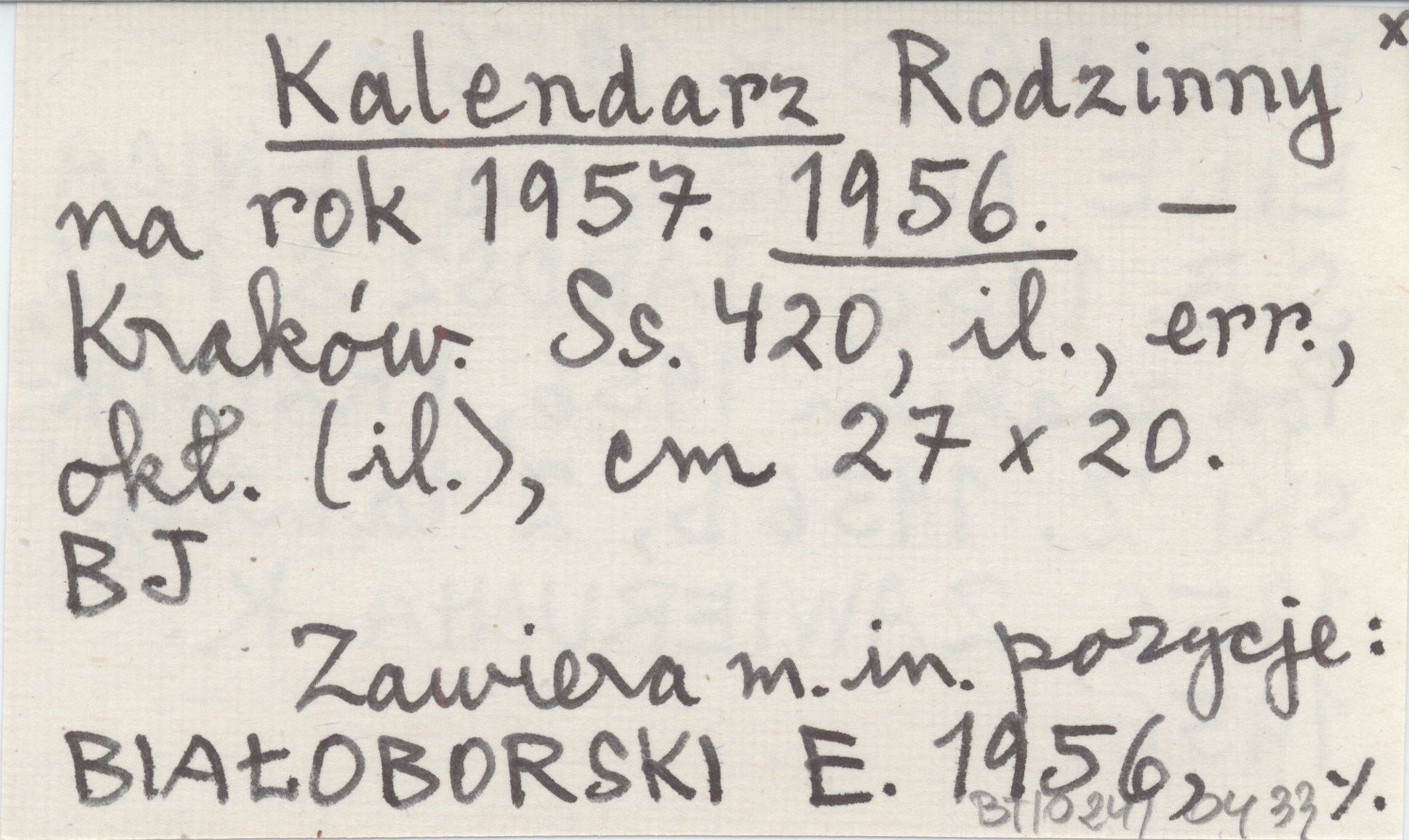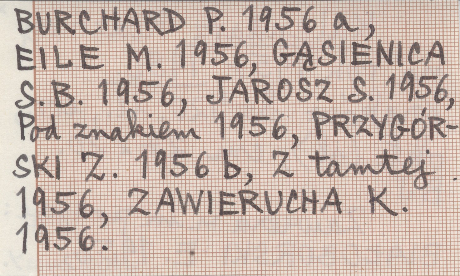 Kraków , 420 s., il., err., okł. (il.), 27x20 cm. Zawiera m. in. pozycje: BIAŁOBORSKI E. 1956, BURCHARD P. 1956 a, EILE M. 1956, GĄSIENICA S. B. 1956, JAROSZ S. 1956, Pod znakiem 1956, PRZYGÓRSKI Z. 1956 b, Z tamtej 1956, ZAWIERUCHA K. 1956.