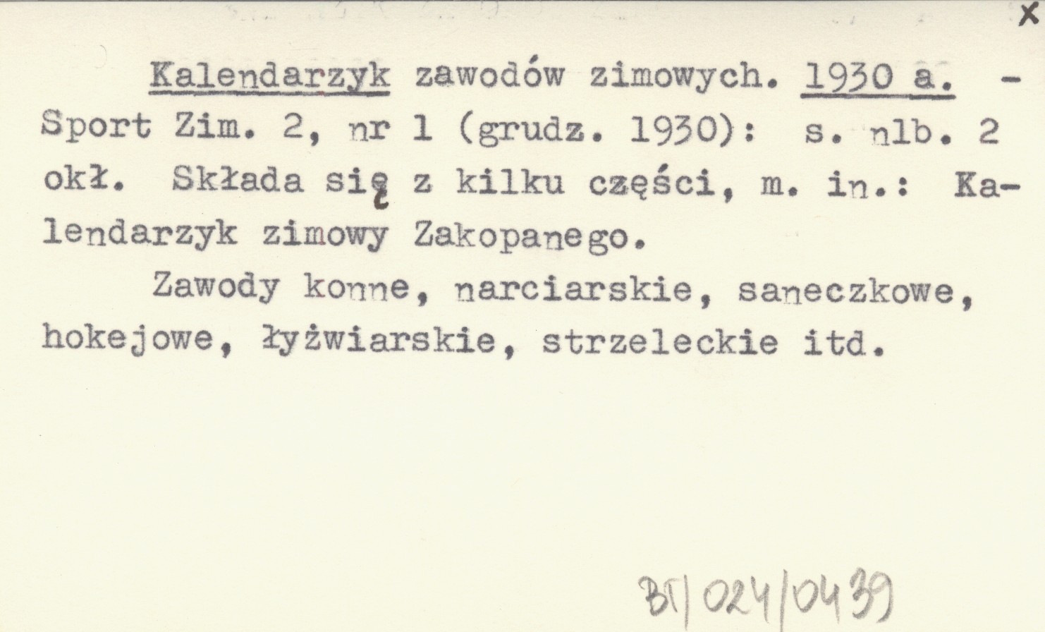 Sport Zimowy, 2, nr 1 (12.1930): [2] s. okł. Zawody konne, narciarskie, saneczkowe, hokejowe, łyżwiarskie, strzeleckie itd. Składa się z kilku części, m. in.: Kalendarzyk zimowy Zakopanego.