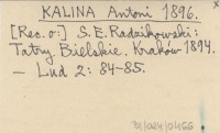 KALINA Antoni 1896 S. E. Radzikowski: Tatry Bielskie. Kraków 1894.