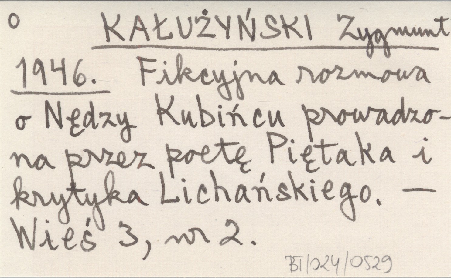 KAŁUŻYŃSKI Zygmunt 1946 Fikcyjna rozmowa o Nędzy Kubińcu prowadzona przez poetę Piętaka i krytyka Lichańskiego.