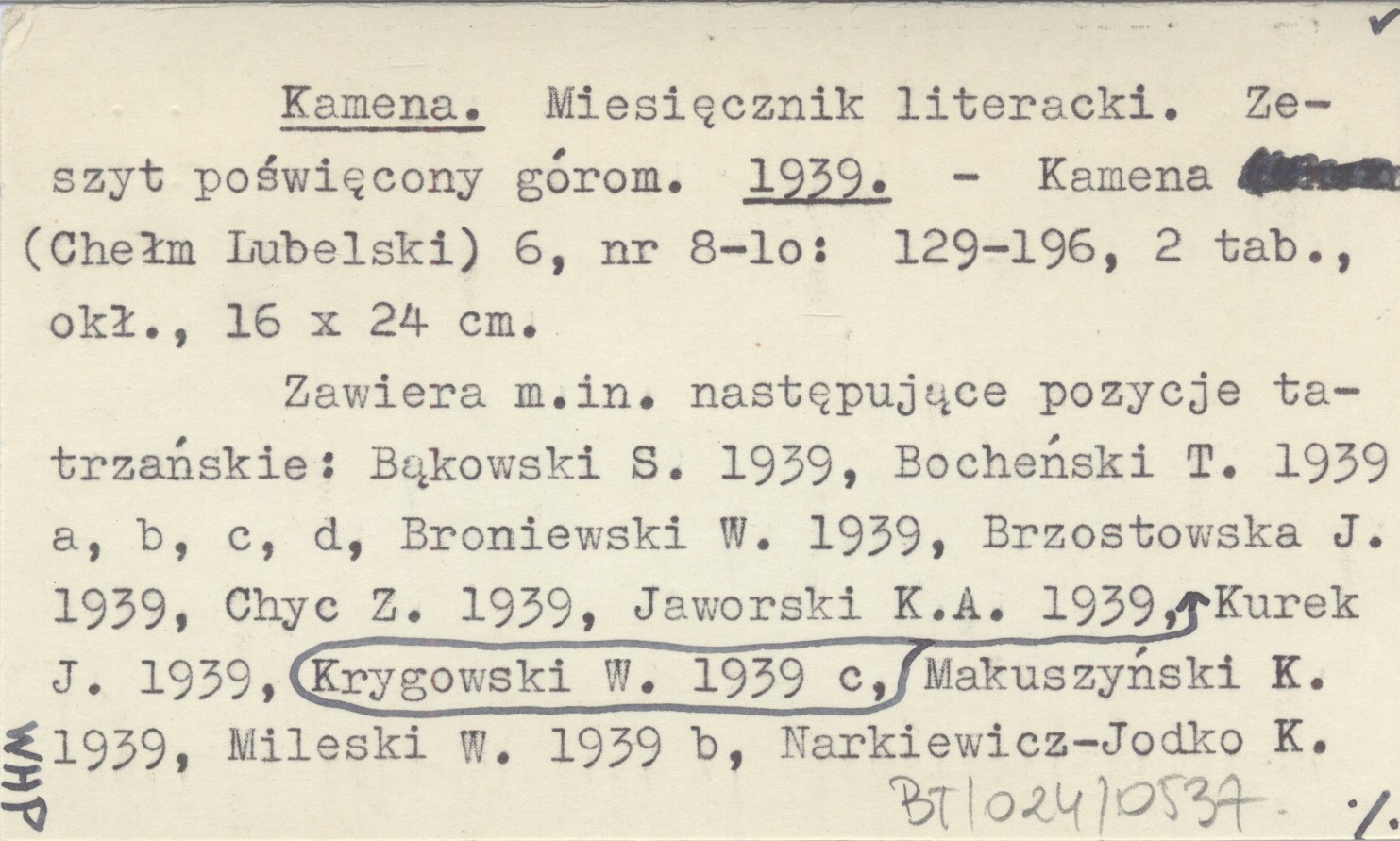 Kamena (Chełm Lubelski) , 6, nr 8-10: 129-196, 2 k., okł., 16x24 cm. Zawiera m.in. następujące pozycje tatrzańskie: Bąkowski S. 1939, Bocheński T. 1939 a, b, c, d, Broniewski W. 1939, Brzostowska J. 1939, Chyc Z. 1939, Jaworski K. A. 1939, Krygowski W. 1939 c, Kurek J. 1939, Makuszyśki K. 1939, Mileski W. 1939 b, Narkiewicz-Jodko K. 1939, Szczepańska M. 1939, Szczepański J. A. 1939 g, h, Szczuka M. 1939, Waśniewski Z. 1939, Wierzyński K. 1939, 1939 a oraz recenzje.