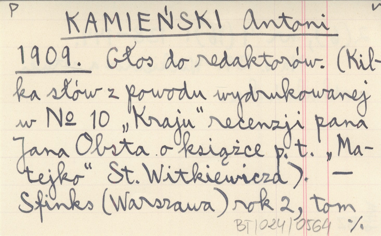KAMIEŃSKI Antoni 1909 Głos do redaktorów. (Kilka słów z powodu wydrukowanej w No 10 "Kraju" recenzji pana Jana Obsta o książce p.t. "Matejko" St. Witkiewicza).