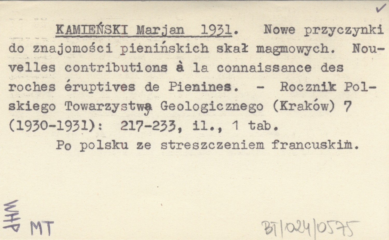 KAMIEŃSKI Marjan 1931 Nowe przyczynki do znajomości pienińskich skał magmowych. Nouvelles contributions à la connaissance des rouches éruptives de Pienines.