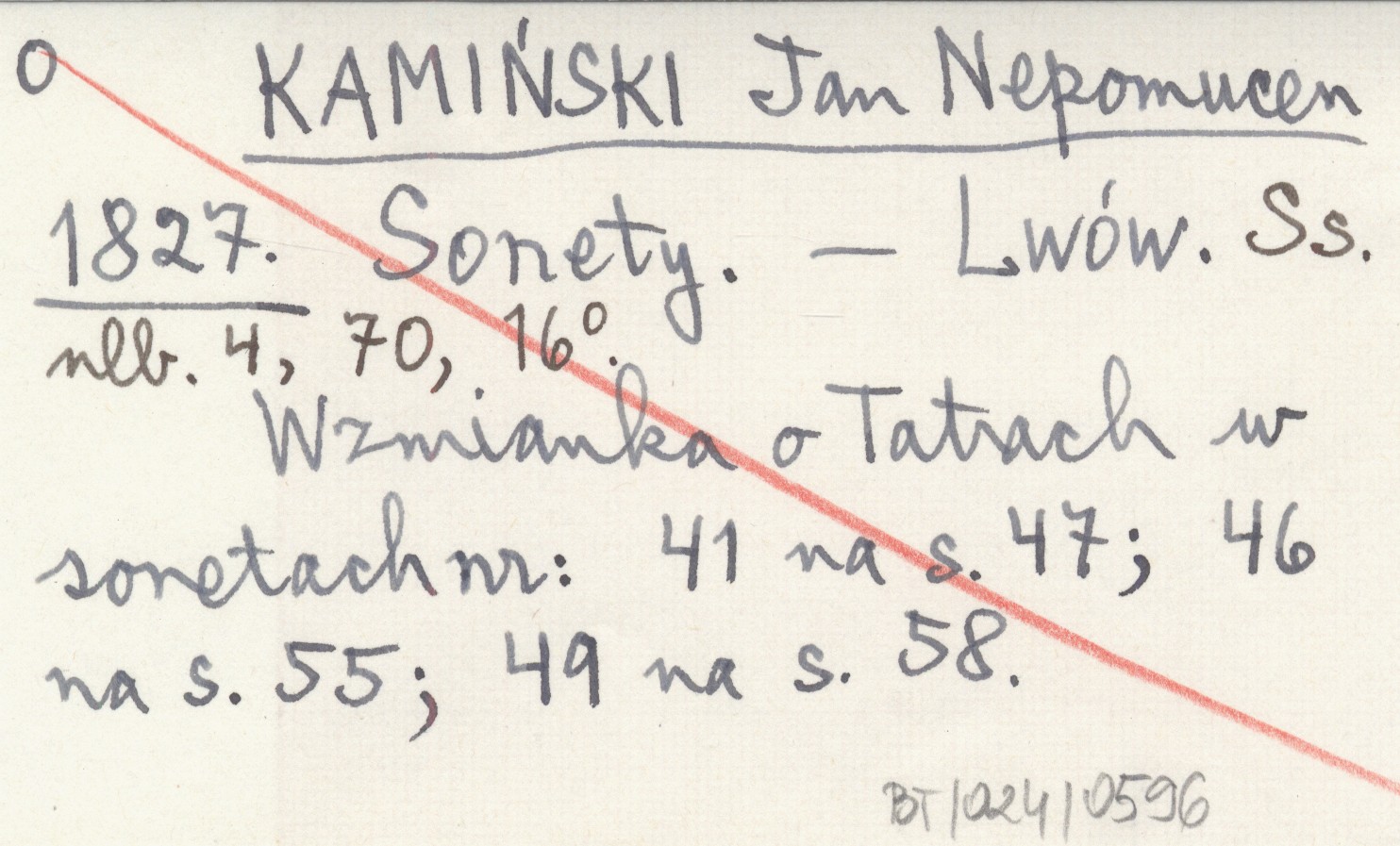 Lwów , [4], 70 s., 16°. Wzmianka o Tatrach w sonetach nr: 41 na s. 47; 46 na s. 55; 40 na s. 58.