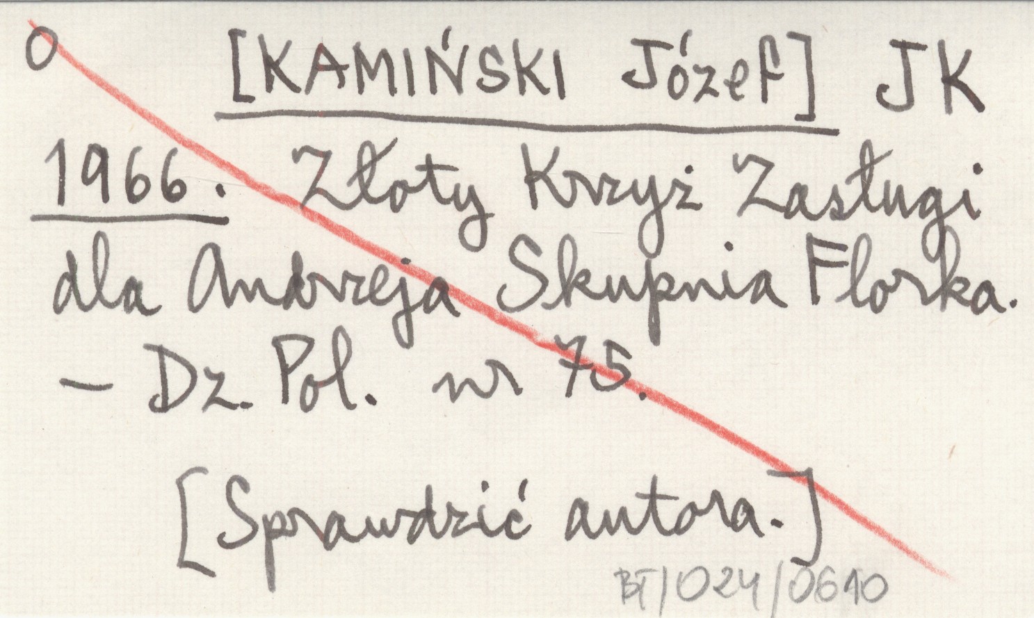 JK [KAMIŃSKI Józef] 1966 Złoty Krzyż Zasługi dla Andrzeja Skupnia Florka.