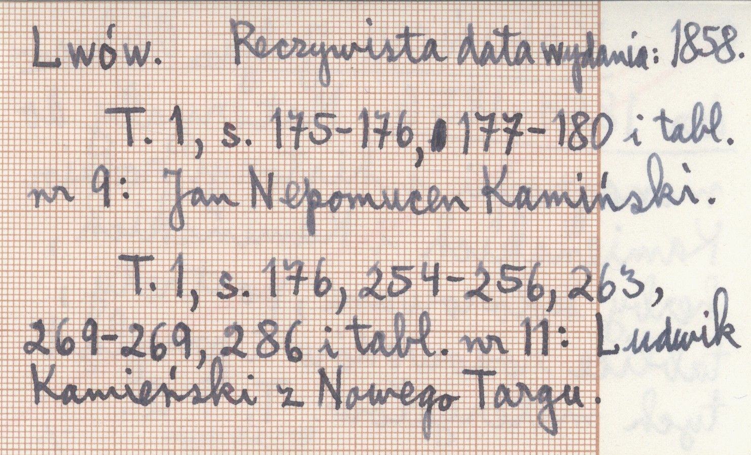 Lwów , T. 1-2. T. 1: 175-176, 177-180 i k. (s. 9): Jan Nepomucen Kamiński. T. 1: 176, 254-256, 263, 269-269, 286 i k. (s. 11): Ludwik Kamieński z Nowego Targu. Rzeczywista data wydania: 1858.