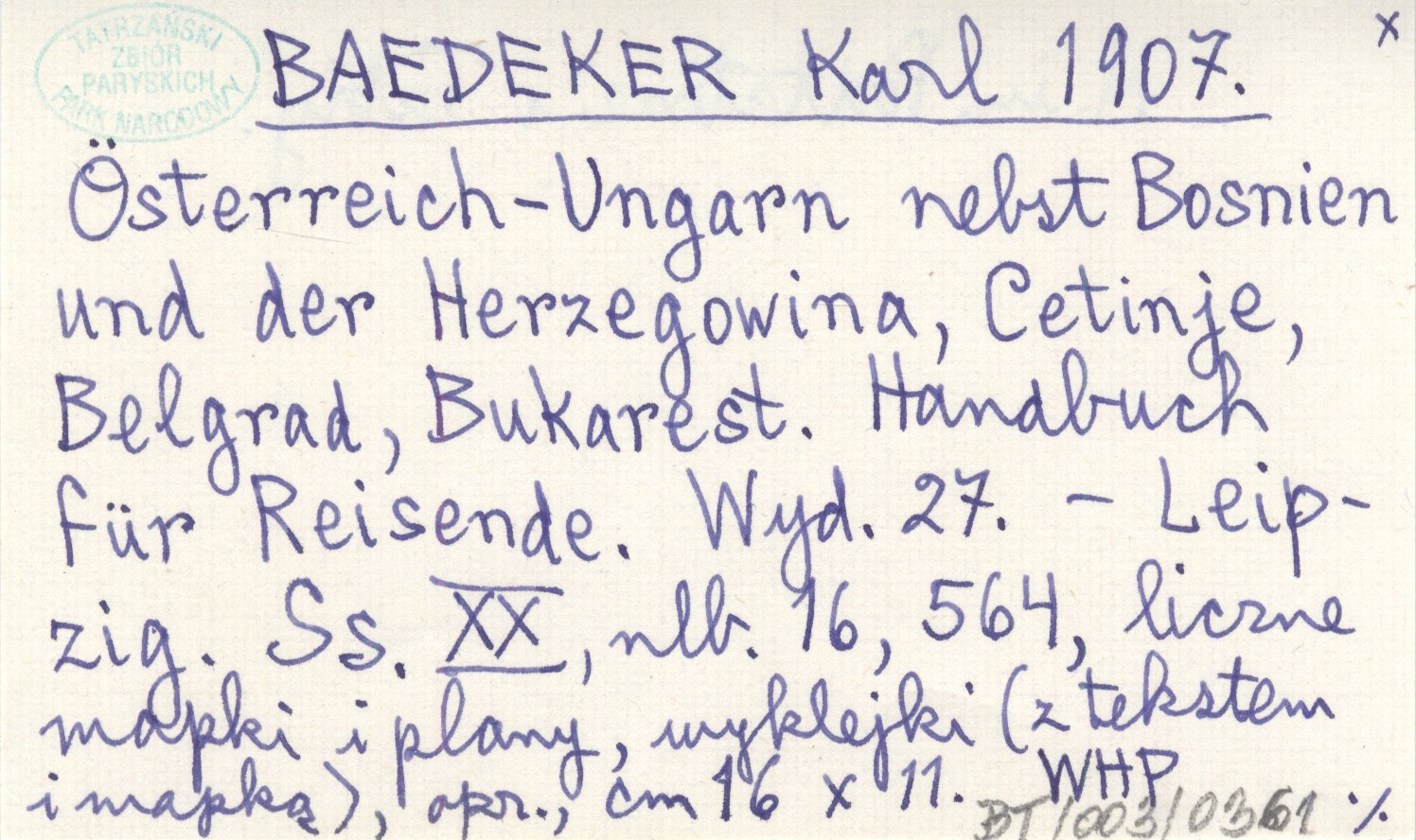 WYD: 27 Leipzig , XX, [16], 564 s., opr., 16x11 cm. M. in. Podtatrze i Tatry. Liczne mapki i plany, wyklejki (z tekstem i mapką).