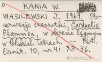 KANIA W. WASILEWSKI, J. ; 1969 Obserwacje czeczotki, Carduelis flammea, w okresie lęgowym w Polskich Tatrach.