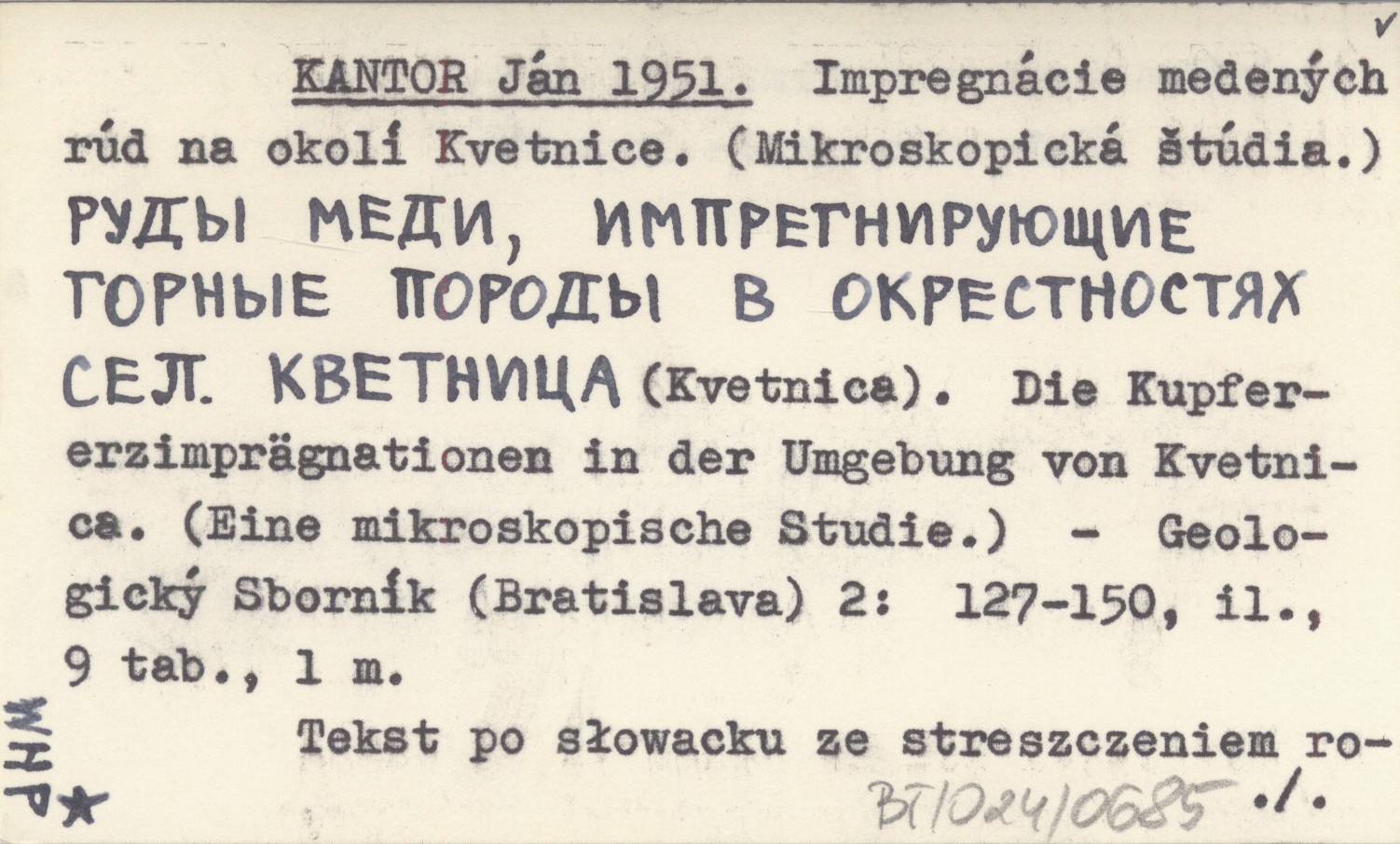 KANTOR Ján 1951 Impregnácie medenęch rúd na okolí Kvetnice. (Mikroskopická čtúdia). Rudy medi impregniruyushchiye torody v okrestnostyakh sela. Kvetnica (Kvetnica). Die Kupfererzimprägnationen in der Umgebung von Kvetnica. (Eine mikroskopische Studie).