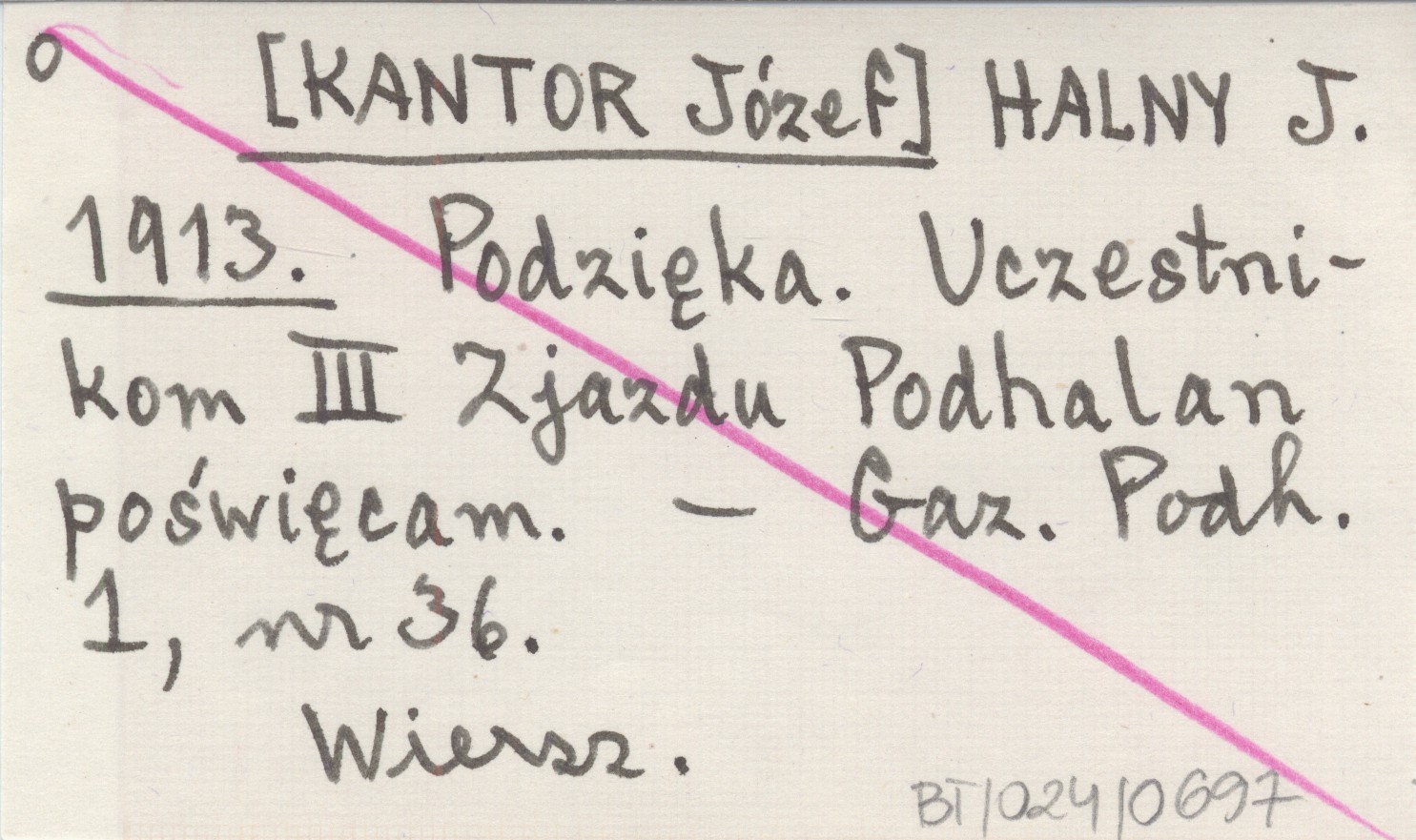 HALNY J. [KANTOR Józef] 1913 Podzięka. Uczestnikom III Zjazdu Podhalan poświęcam.
