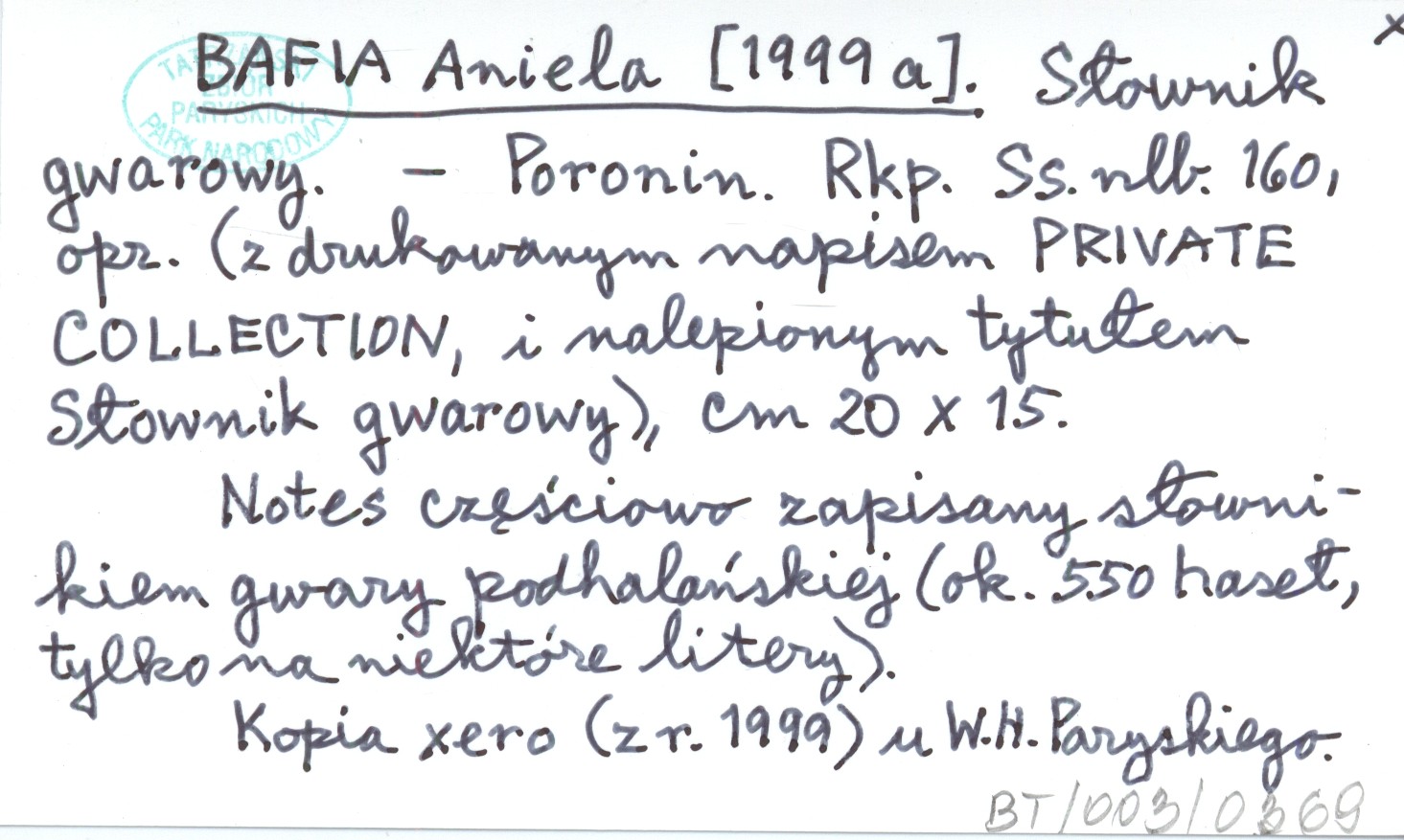 Poronin , [160] s., opr., 20x15 cm. Notes częściowo zapisany słownikiem gwary podhalańskiej (ok. 550 haseł, tylko na niektóre litery). Rękopis. Kopia xero (z r. 1999) u W. H. Paryskiego.