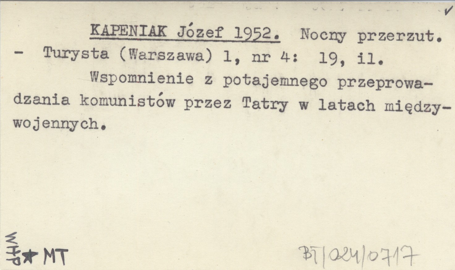 Turysta (Warszawa) , 1, nr 4: 19, il. Wspomnienie z potajemnego przeprowadzania komunistów przez Tatry w latach międzywojennych.