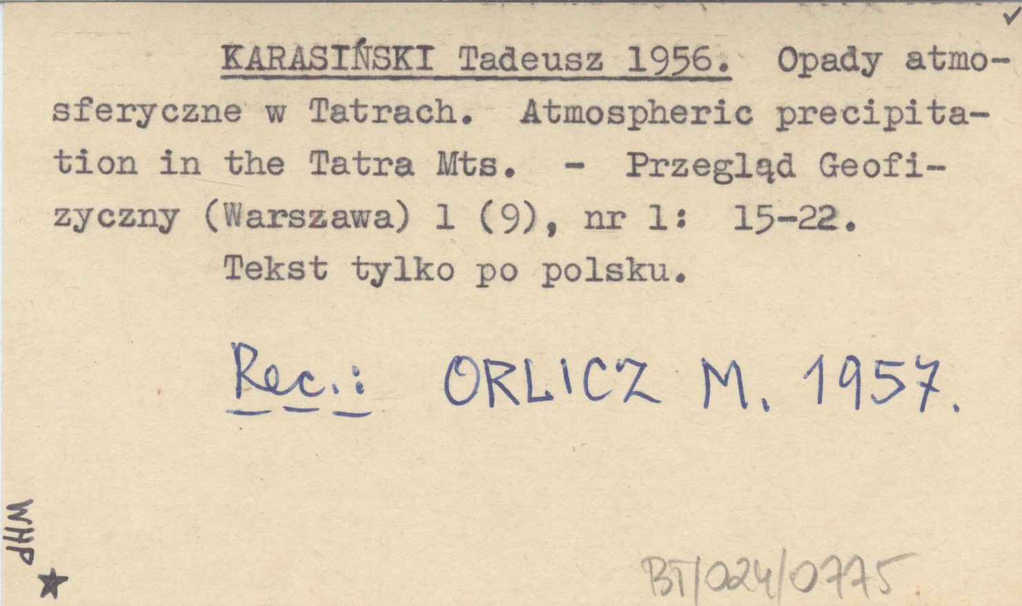 KARASIŃSKI Tadeusz 1956 Opady atmosferyczne w Tatrach. Atmospheric precipitation in the Tatra Mts.