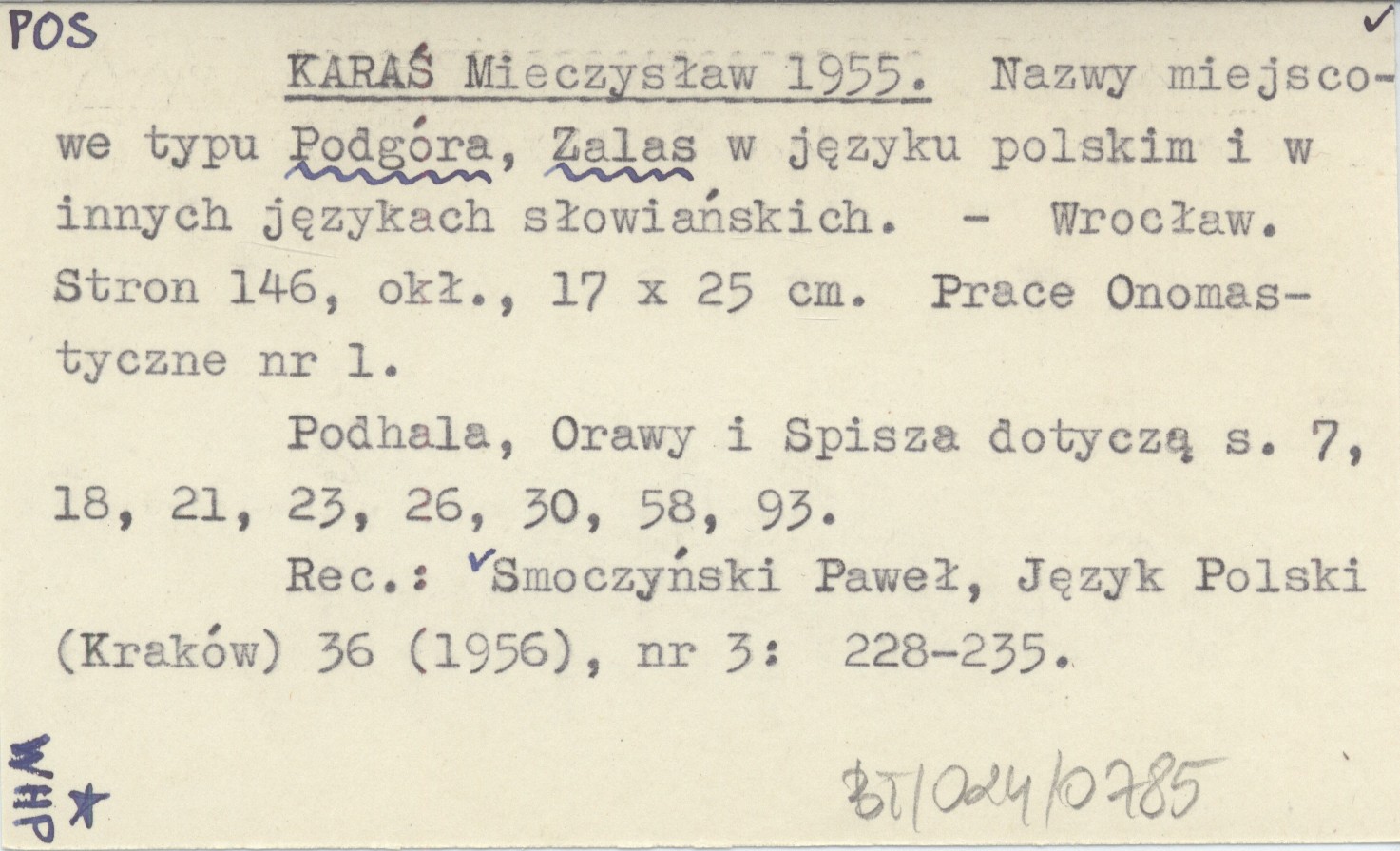 Wrocław (Prace Onomastyczne ; 1) , 146 s., okł., 17x25 cm. Podhala, Orawy i Spisza dotyczą s. 7, 18, 21, 23, 26, 30, 58, 93. REC: Smoczyński Paweł, Język Polski (Kraków) 36 (1956), nr 3: 228-235.