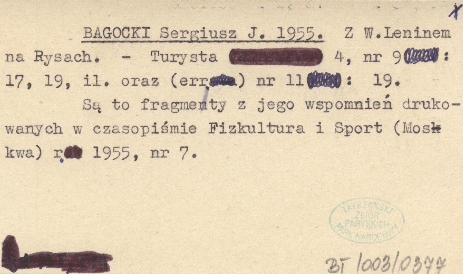 Turysta, 4, nr 9: 17, 19, il., err. ; nr 11: 19. Są to fragmenty z jego wspomnień drukowanych w czasopiśmie Fizkultura i Sport (Moskwa) r. 1955, nr 7.