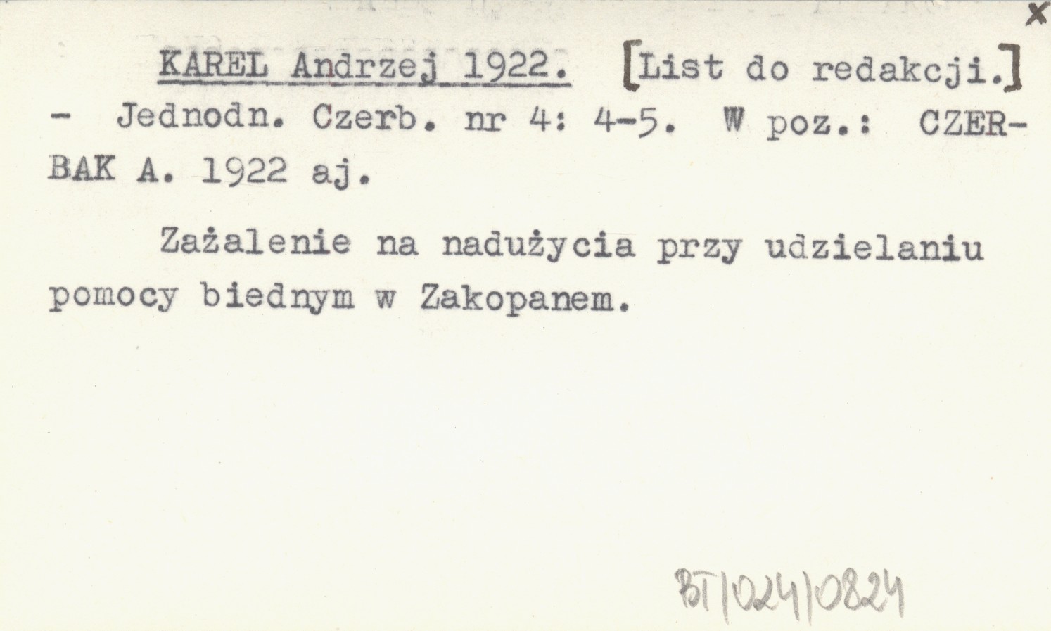 Jednodniówka Czerbaka, Nr 4: 4-5. Zażalenie na nadużycia przy udzielaniu pomocy biednym w Zakopanem. W poz.: CZERBAK A. 1922 aj.