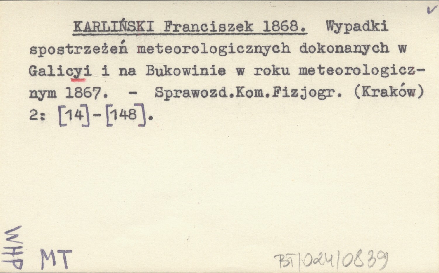 KARLIŃSKI Franciszek 1868 Wypadki spostrzeżeń meteorologicznych dokonanych w Galicyi i na Bukowinie w roku meteorologicznym 1867.