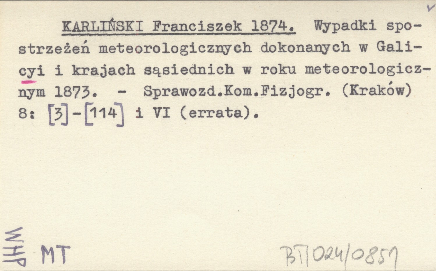 KARLIŃSKI Franciszek 1874 Wypadki spostrzeżeń meteorologicznych dokonanych w Galicyi i krajach sąsiednich w roku meteorologiczny 1873.