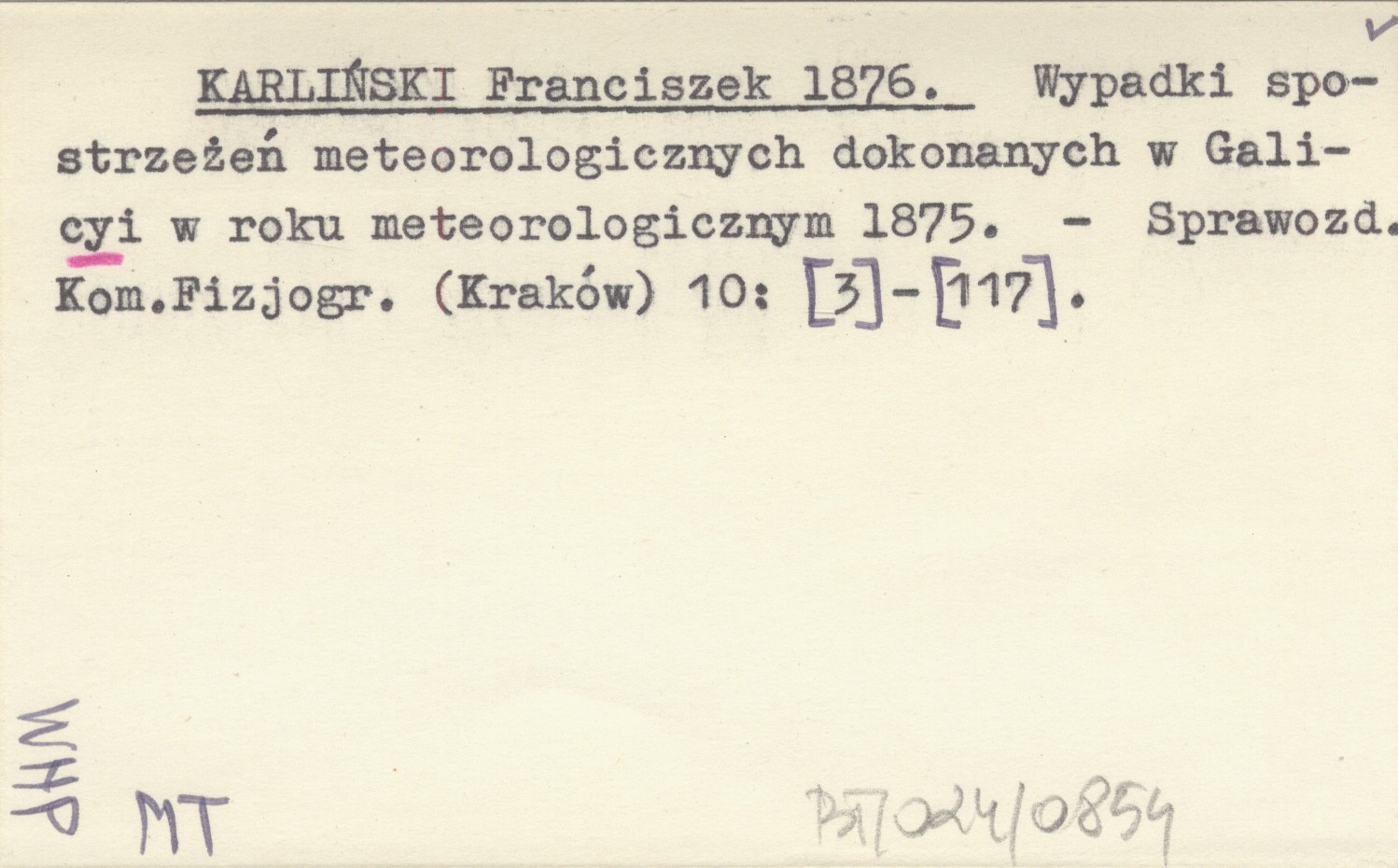 KARLIŃSKI Franciszek 1876 Wypadki spostrzeżeń meteorologicznych dokonanych w Galicyi w roku meteorologicznym 1875.