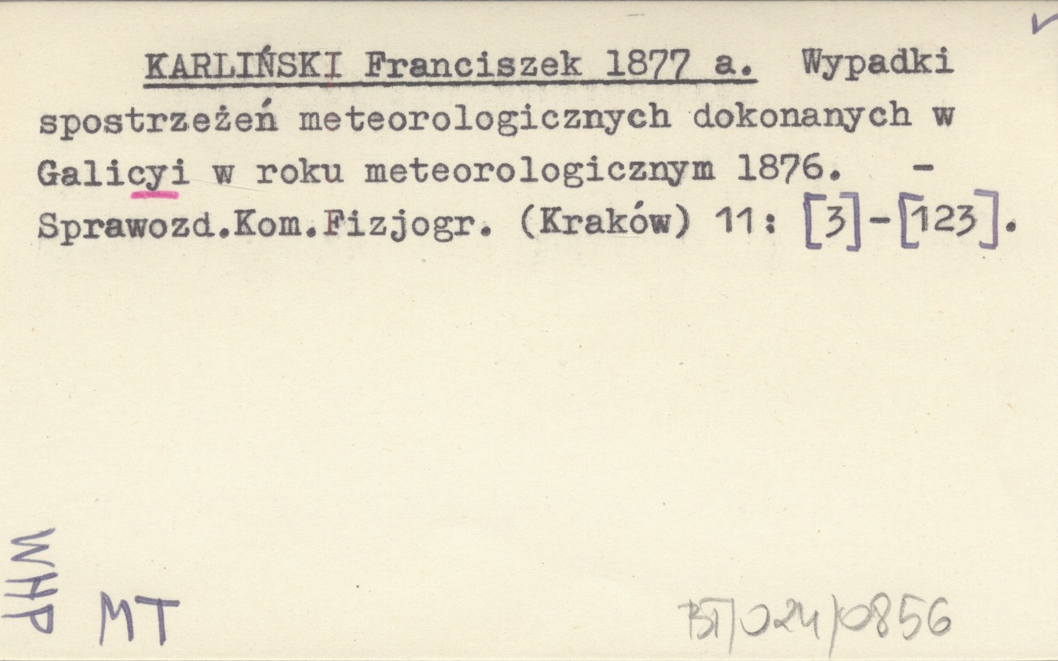 KARLIŃSKI Franciszek 1877 a Wypadki spostrzeżeń meteorologicznych dokonanych w Galicyi w roku meteorologicznym 1876.