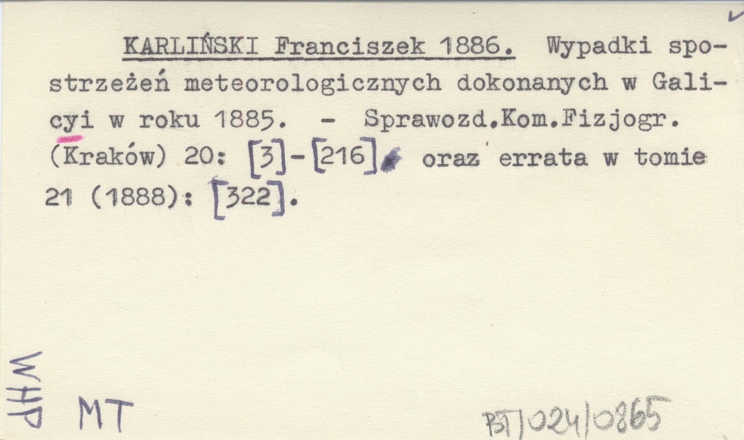 KARLIŃSKI Franciszek 1886 Wypadki spostrzeżeń meteorologicznych dokonanych w Galicyi w roku 1885.