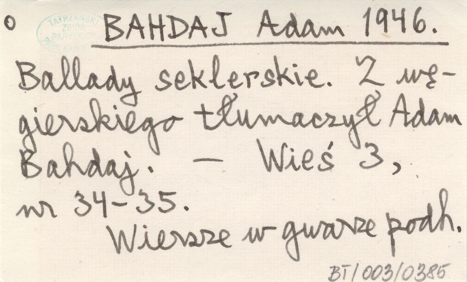 BAHDAJ Adam 1946 Ballady seklerskie. Z węgierskiego tłumaczył Adam Bahdaj.